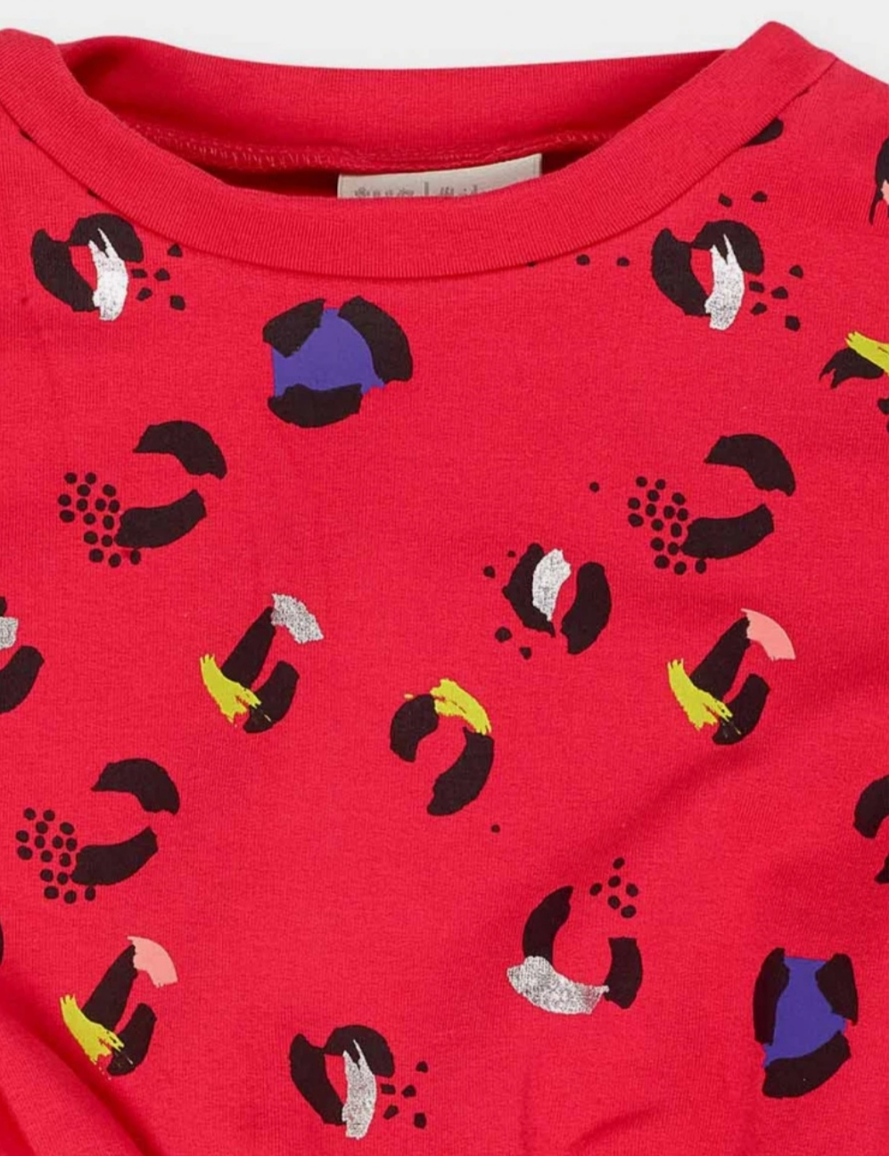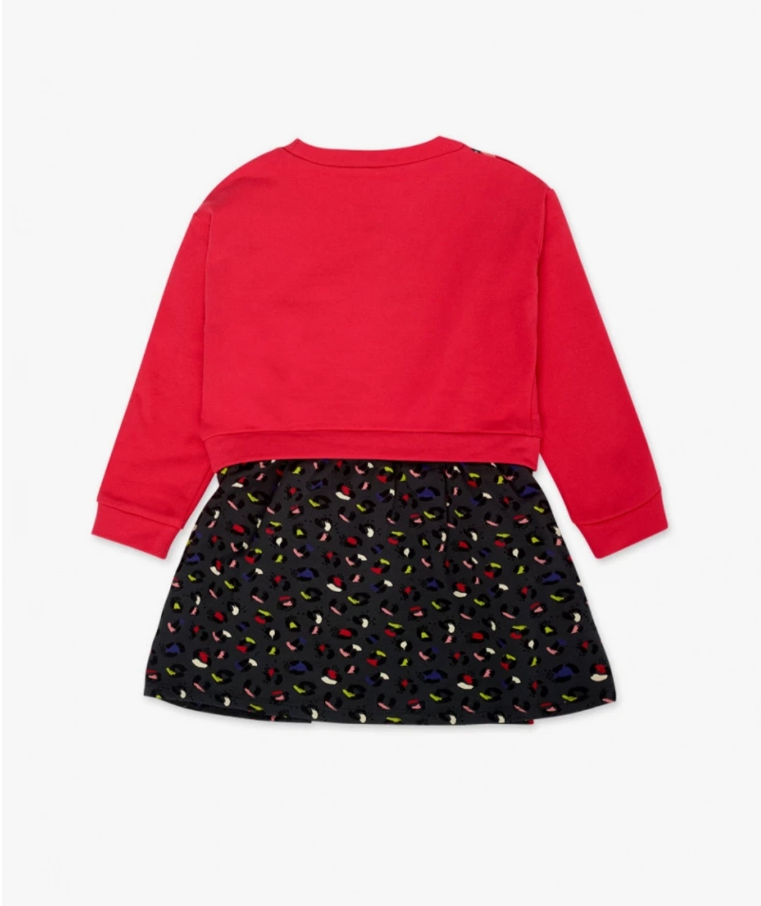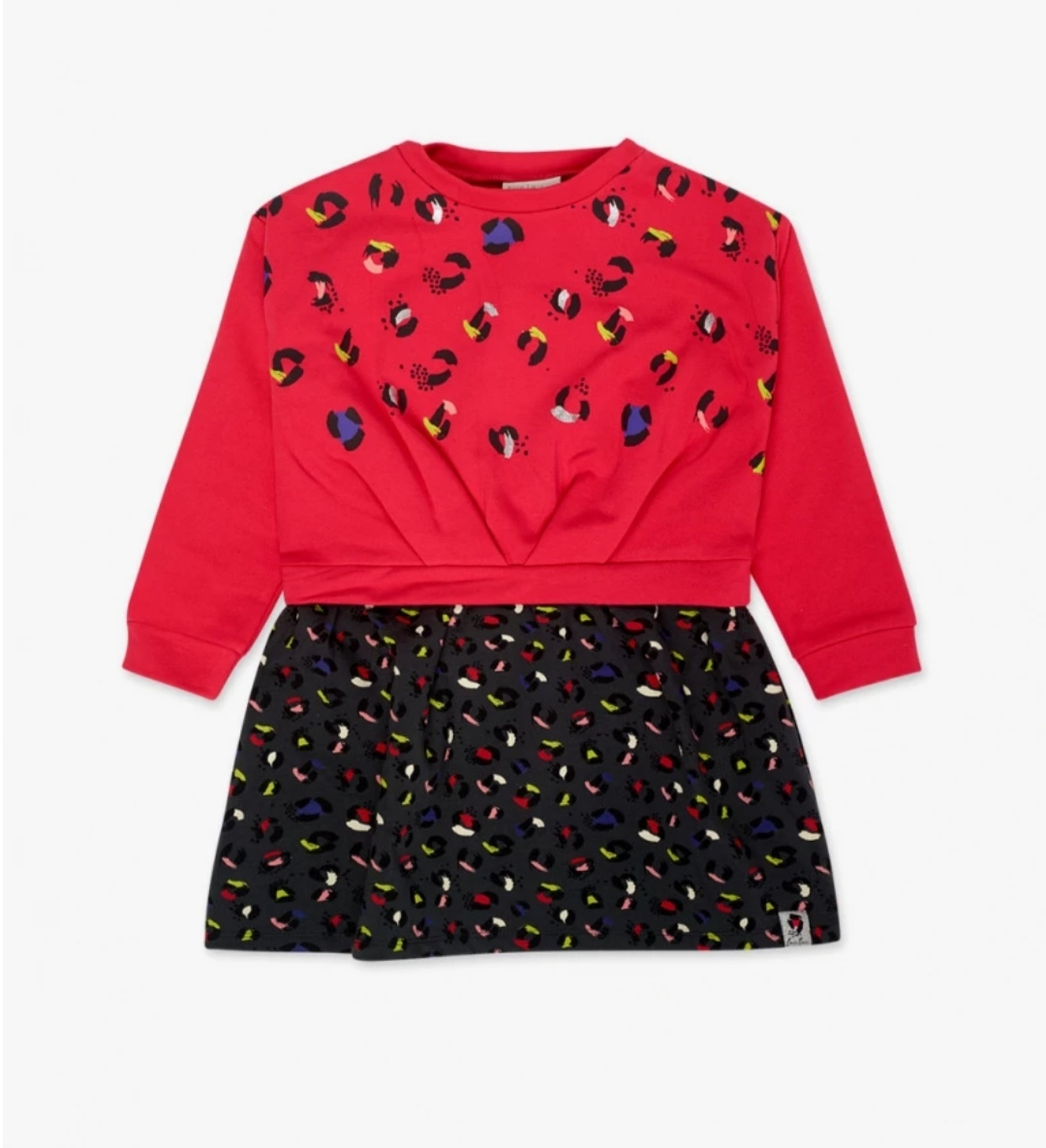 Βαμβακερό φόρεμα σε ροζ κοραλί χρώμα το πάνω μέρος και γκρί ανθρακί με ιδιαίτερο animal all over το κάτω μέρος είναι από τη συλλογή Wild & free της TUC TUC.