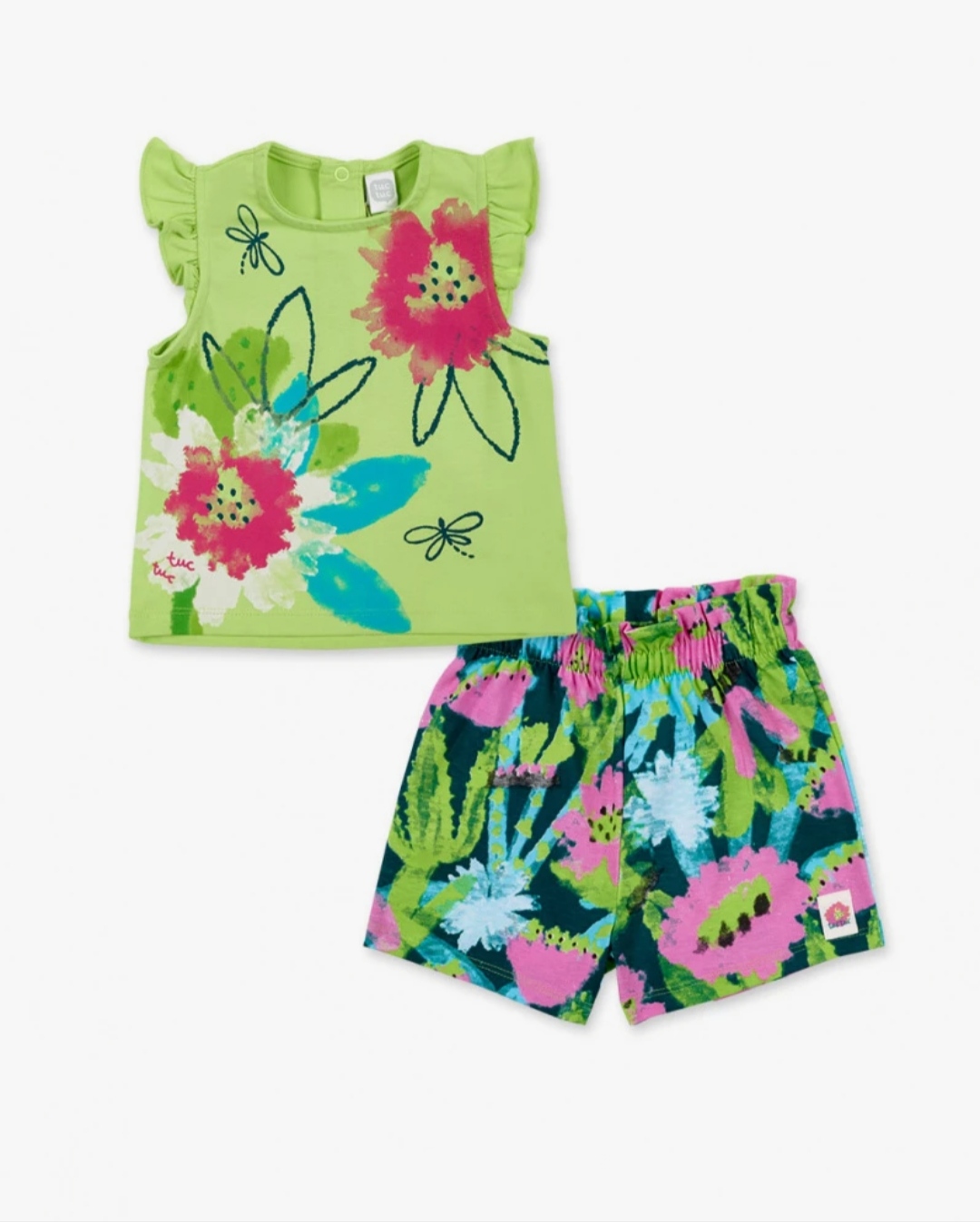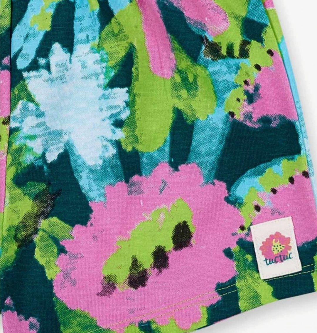 Σετ 2 τεμαχίων βαμβακερή μακό ελαστική η μπλούζα σε πράσινο ανοιχτό λαχανί χρώμα,το σορτς εμπριμε all over λουλούδια από τη συλλογή TROPADELIC 🌊 της TUC TUC.