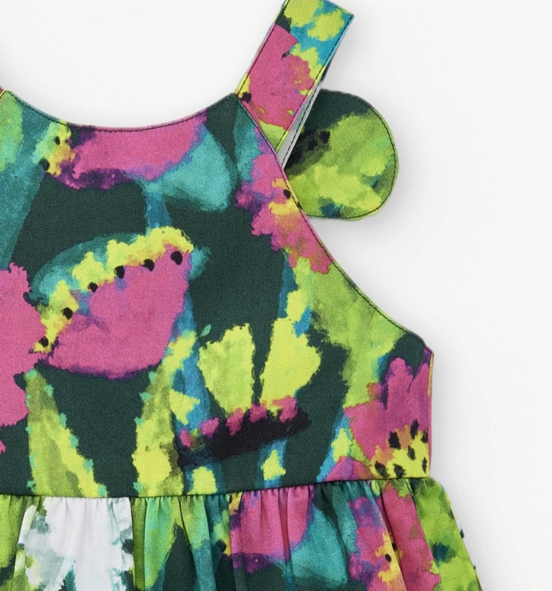 Έχει στρογγυλή λαιμόκοψη,τιράντες με λεπτομέρεια φτερά πεταλούδας στο πίσω μέρος,αφήνει ακάλυπτους τους ώμους και την πλάτη.