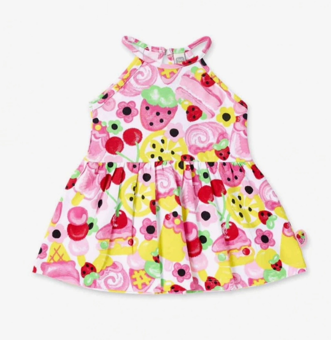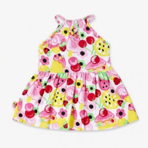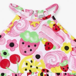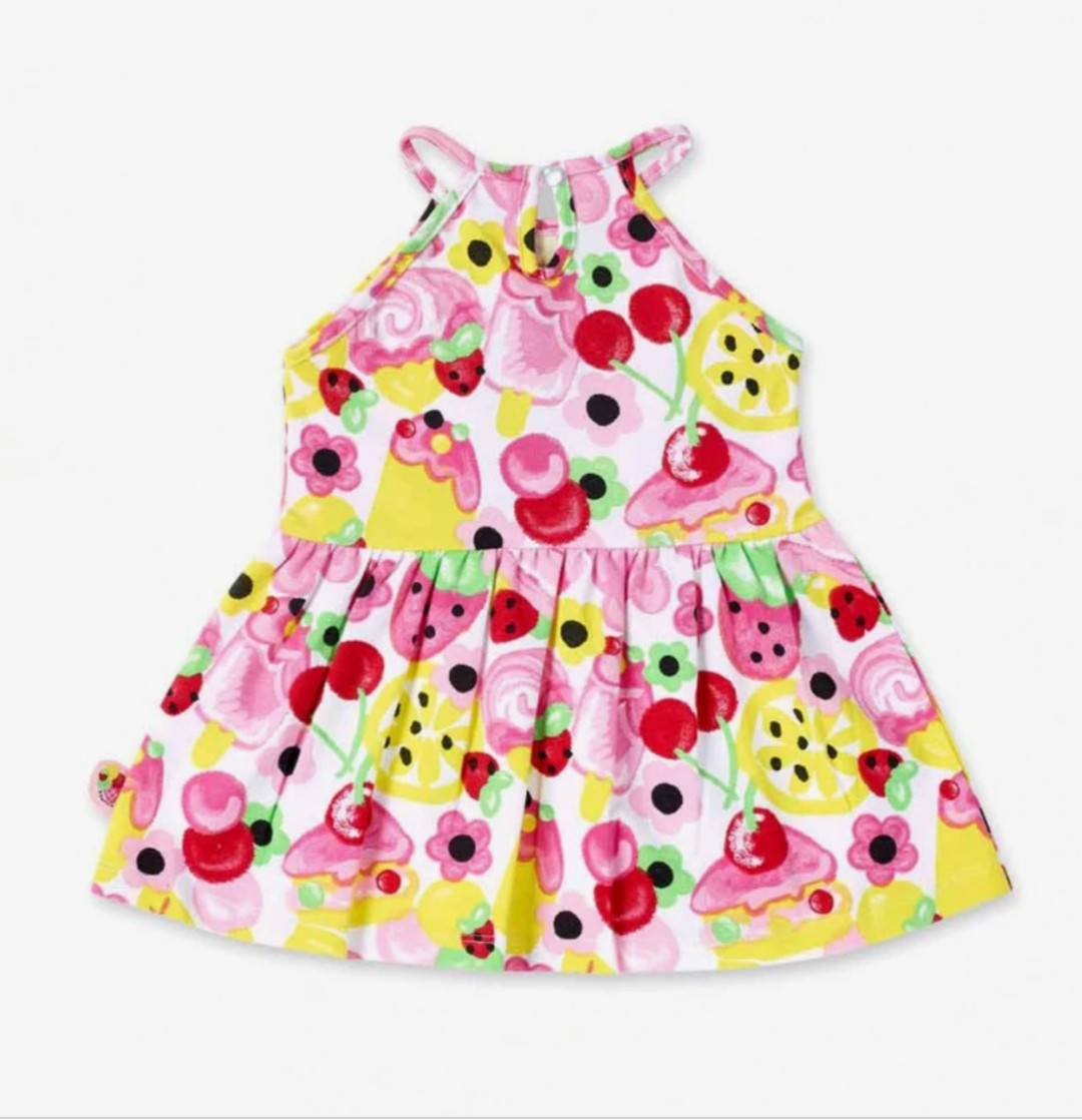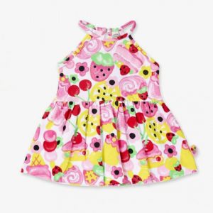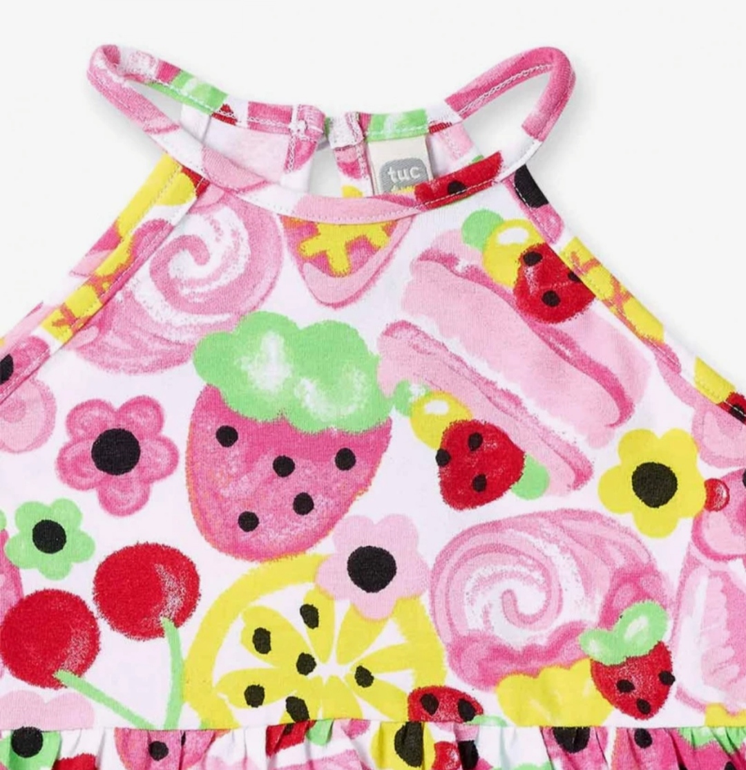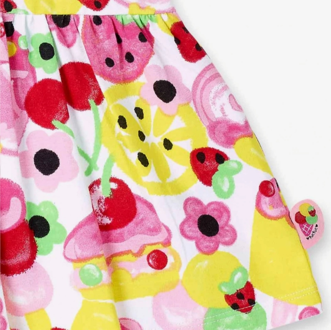 Φόρεμα βαμβακερό μακό ύφασμα σε λευκό χρώμα λουλούδια, παγωτά , φρούτα, γλυκίσματα all over από τη συλλογή CREAMY ICE της TUC TUC.